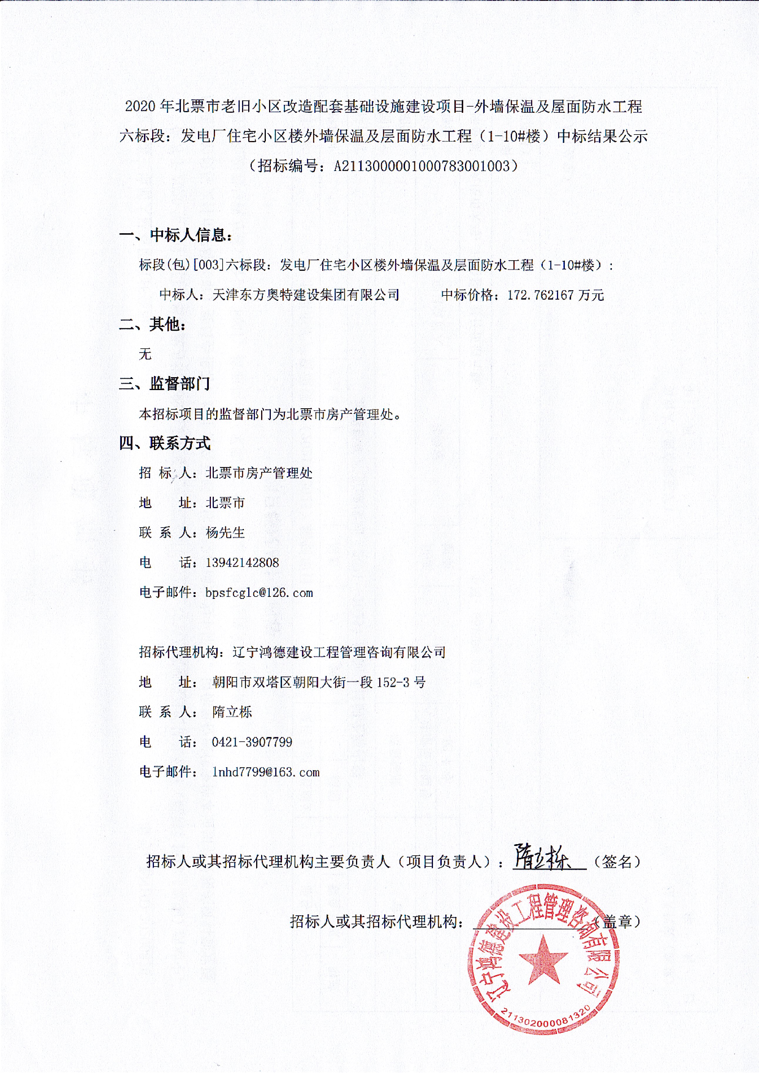 2020年北票市老舊小區(qū)改造配套基礎(chǔ)設(shè)施建設(shè)項目-外墻保溫及屋面防水工程六標(biāo)段:發(fā)電廠住宅小區(qū)樓外墻保溫及層面防水工程(1-10#樓)中標(biāo)結(jié)果公示