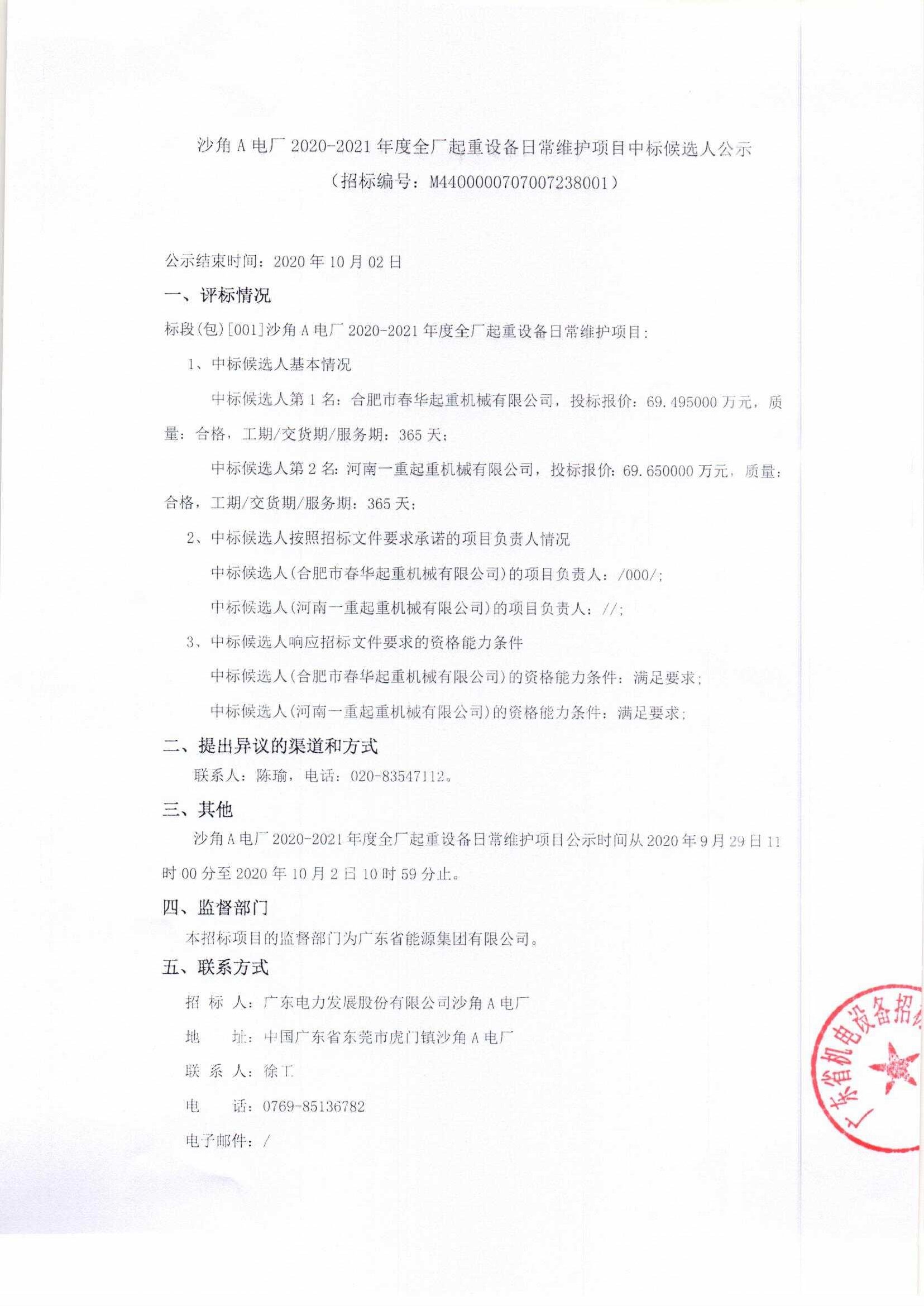 移動(dòng)版:沙角A電廠2020-2021年度全廠起重設(shè)備日常維護(hù)項(xiàng)目中標(biāo)候選人公示