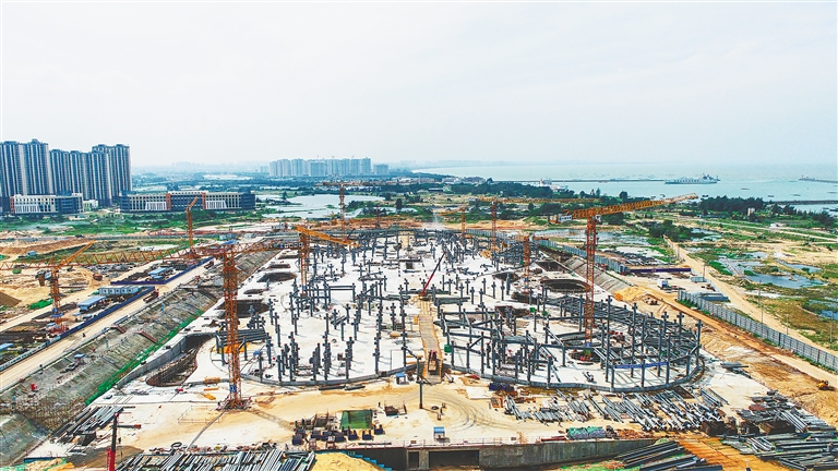 近日,航拍位于??谑形骱0兜暮?谑袊?guó)際免稅城項(xiàng)目5號(hào)地塊施工現(xiàn)場(chǎng)。目前該項(xiàng)目的免稅商業(yè)中心已完成地下結(jié)構(gòu)施工,正在進(jìn)行地上鋼結(jié)構(gòu)施工。