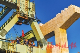 道慶洲大橋鋼桁梁橋最后一根公路橫梁正在吊裝。