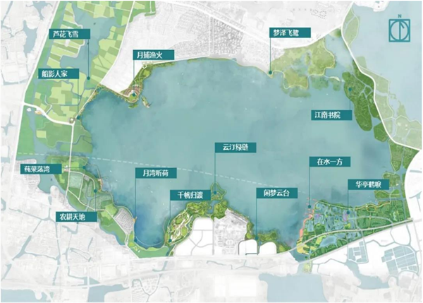 最終,元蕩在整體上形成了協(xié)調(diào)、統(tǒng)一、有機(jī)的規(guī)劃藍(lán)圖,從而避免了機(jī)械式的方案拼合。在“一環(huán)六灣”的基礎(chǔ)上,青吳兩地還以“生態(tài)新典范,智慧新湖灣”為主要愿景,共同規(guī)劃了“十二景”:月灣聽荷、千帆歸渡、云汀綠鏈、蘆花飛雪……新的設(shè)計(jì)思路、新的設(shè)計(jì)手法、新的生活感受,江南水鄉(xiāng)韻味在青吳兩地共顯。
