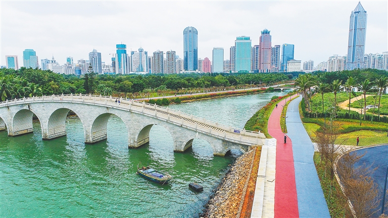 18時(shí),海南日?qǐng)?bào)記者來(lái)到??跒逞匕兜?ldquo;三道”三期工程。路面寬敞,市民游客往來(lái)如梭,舉目遠(yuǎn)眺,萬(wàn)綠園的美景盡收眼底。