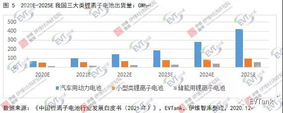 在汽車用動(dòng)力電池領(lǐng)域,隨著新能源汽車滲透率逐步提升,預(yù)計(jì)到2025年,我國(guó)動(dòng)力電池出貨量可達(dá)422.28GWh;在小型類鋰離子電池領(lǐng)域,可穿戴設(shè)備、無(wú)人機(jī)、小動(dòng)力等新興消費(fèi)領(lǐng)域?qū)?dòng)小型類鋰離子電池出貨量增長(zhǎng),預(yù)計(jì)到2025年,我國(guó)小型類鋰離子電池出貨量為96.0GWh;在儲(chǔ)能用鋰離子電池領(lǐng)域,隨著電力體制改革推進(jìn)、儲(chǔ)能成本降低以及鋰電替代鉛酸進(jìn)程加速,預(yù)計(jì)到2025年,我國(guó)儲(chǔ)能電池出貨量可達(dá)60.0GWh。