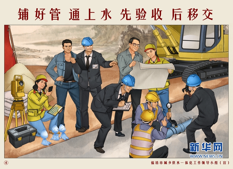 “戶戶通有計劃做設(shè)計出圖紙”“全動員齊出力定模式籌資金”“找隊伍買材料細施工強監(jiān)督”“鋪好管通上水先驗收后移交”“優(yōu)質(zhì)水供城鄉(xiāng)新福清更小康”,這5句話配上5幅色彩明亮、生動活潑的畫面,組成了福清推進城鄉(xiāng)供水一體化的政策宣解插畫。