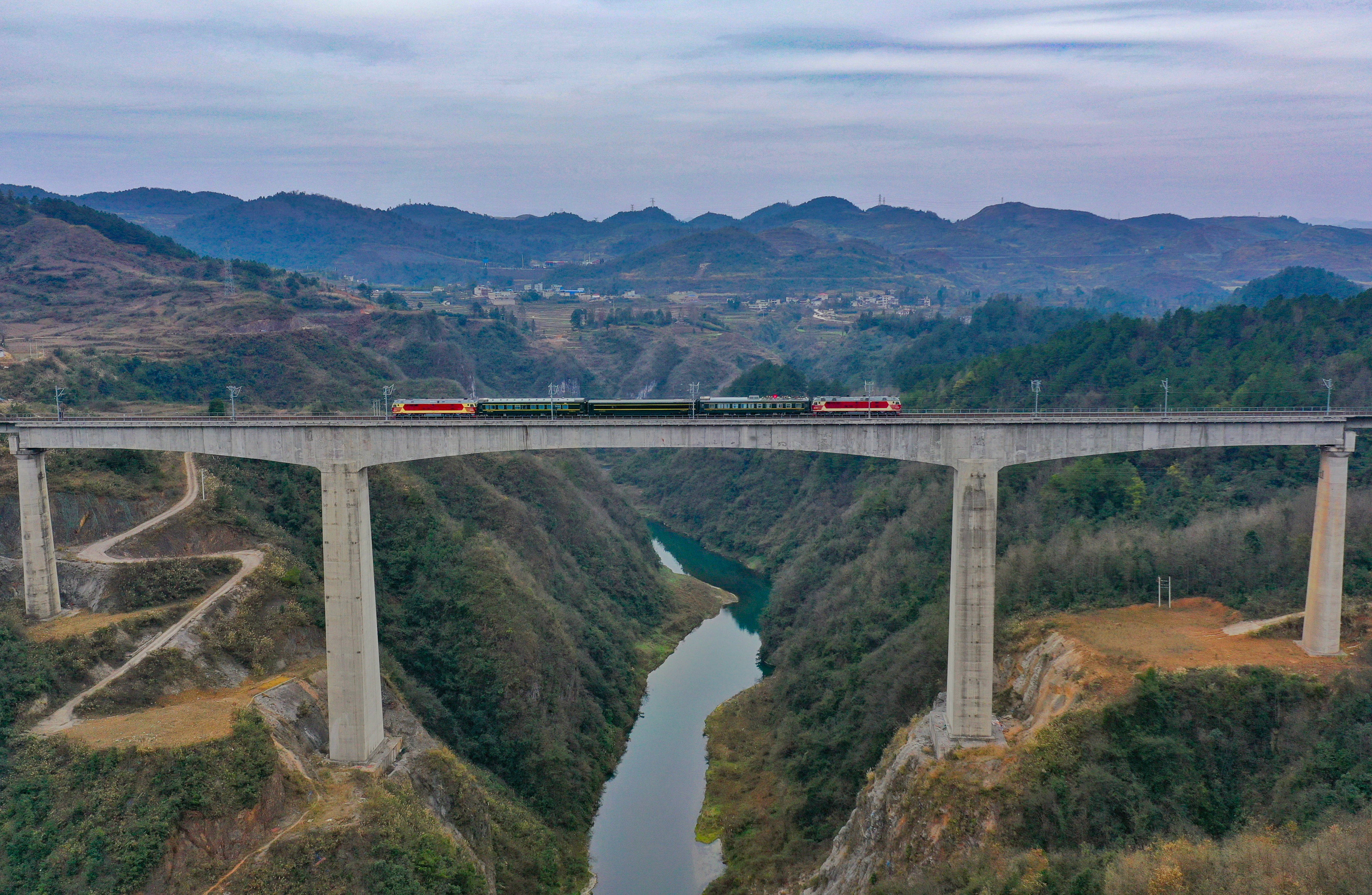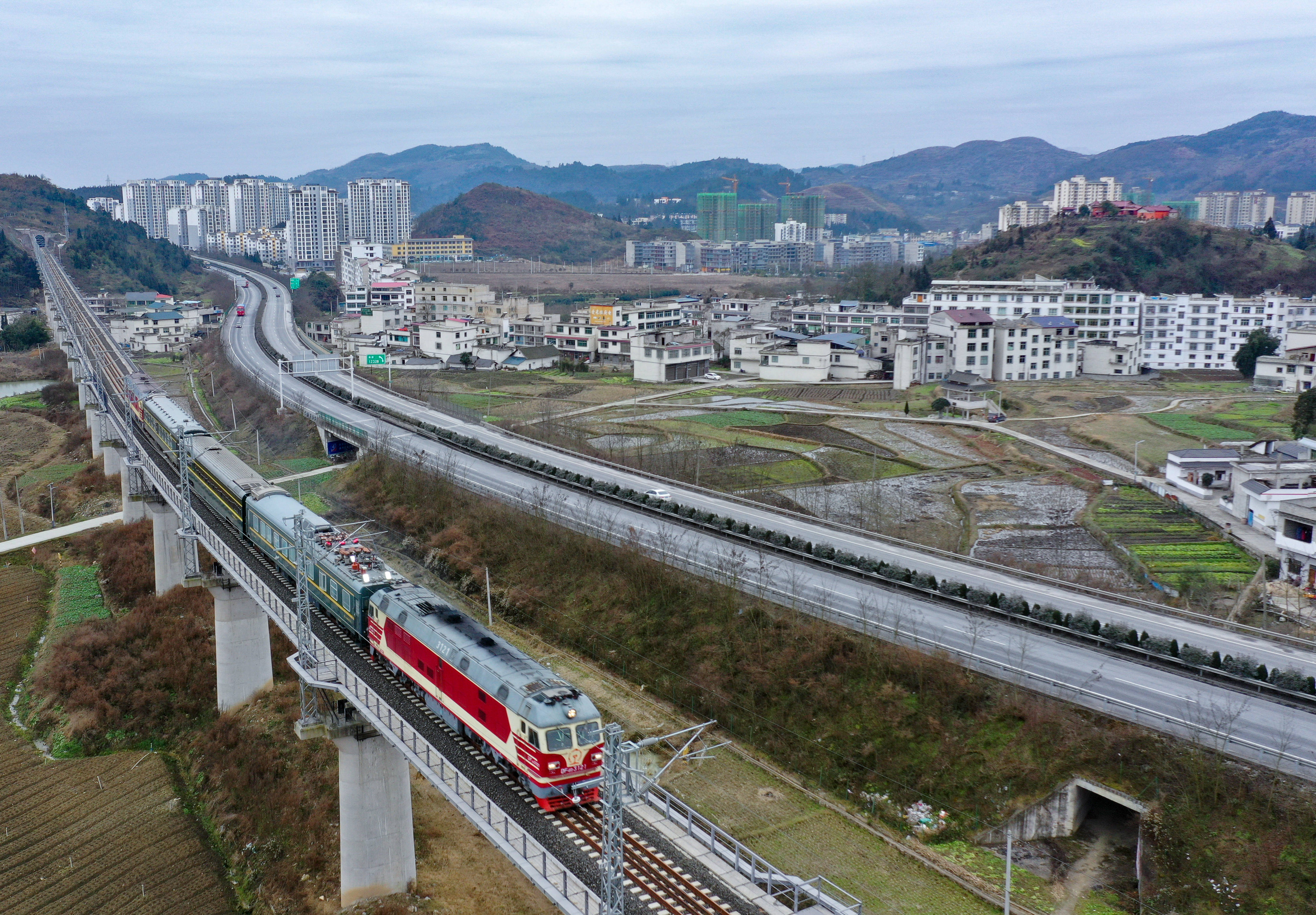 1月9日,檢測(cè)列車停靠在甕安站內(nèi)準(zhǔn)備出發(fā)(無(wú)人機(jī)照片)。