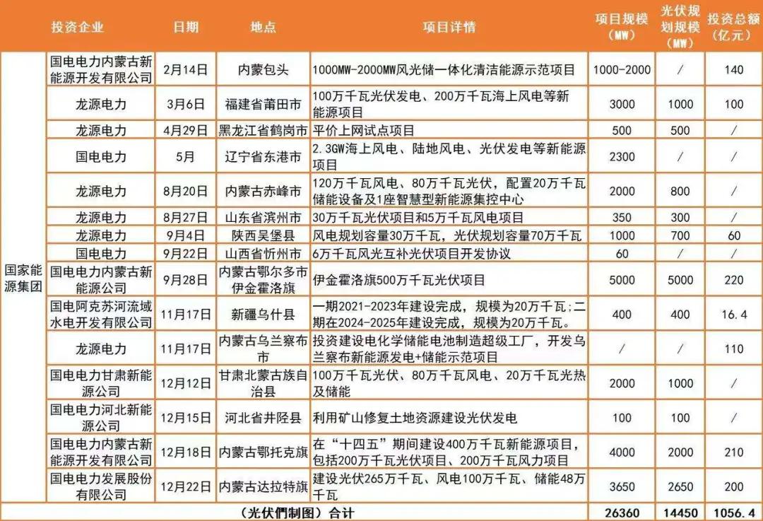 在這一大目標(biāo)之下,光伏們獨家獲悉,“十四五”期間,國家能源集團(tuán)光伏計劃新增50GW,其中2021年光伏目標(biāo)裝機(jī)為10GW,項目收購與自主開發(fā)同步推進(jìn)。在2020年9月份的一場論壇上,國家能源集團(tuán)董事長王祥喜曾表示,清潔能源規(guī)?;木唧w措施包括擴(kuò)大可再生能源投資,提高清潔能源比重,推進(jìn)風(fēng)光火儲一體化,規(guī)劃建設(shè)千萬千瓦級綜合能源基地等。