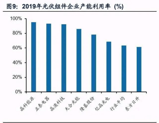 由于組件環(huán)節(jié)具有較高的資產(chǎn)周轉(zhuǎn)率和投入資本回報(bào)率,吸引大量產(chǎn)業(yè)資本進(jìn)入,基于對全球光伏新增裝機(jī)未來前景的判斷,組件產(chǎn)能總是超配實(shí)際裝機(jī)需求, 導(dǎo)致組件環(huán)節(jié)產(chǎn)能長期過剩。根據(jù)光伏行業(yè)協(xié)會,2019年全球組件產(chǎn)能218.7GW, 產(chǎn)量138GW,產(chǎn)能利用率63.2%。企業(yè)產(chǎn)能利用率分化明顯,其中晶科能源、正泰 電器、晶澳科技、天合光能、隆基股份組件業(yè)務(wù)產(chǎn)能利用率分別達(dá)到95.3%、93.2%、 92.5%、85.9%、78.4%,顯著高于行業(yè)平均產(chǎn)能利用率。