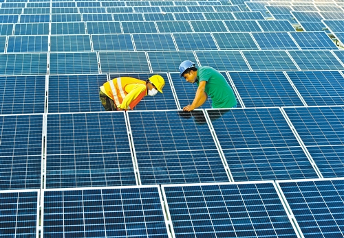 從去年開始,中資制衣類企業(yè)——利德成集團在其位于孟加拉國達卡的廠區(qū)內(nèi)建設(shè)光伏電站,以降低對傳統(tǒng)能源的依賴,減少碳排放,從綠色發(fā)展的角度助力“一帶一路”建設(shè)。圖為在利德成集團廠區(qū),工人們在房頂組裝光伏模組。