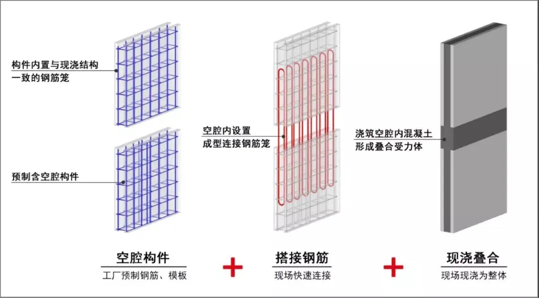 據(jù)了解,SPCS 3.0結(jié)構(gòu)技術(shù)體系以“空腔+搭接+現(xiàn)澆”為核心,通過工廠預(yù)制含鋼筋籠的空腔構(gòu)件,代替了現(xiàn)場綁鋼筋、支模板的工作,大量減少了現(xiàn)場施工量,對過去復(fù)雜的施工工序進行簡約。其次,空腔內(nèi)安放成型連接鋼筋籠,通過搭接即可實現(xiàn)預(yù)制構(gòu)件間的連接,較傳統(tǒng)構(gòu)件而言,操作便利且效率更高。此外,空腔內(nèi)澆注混凝土,形成疊合受力體,確保整體安全。