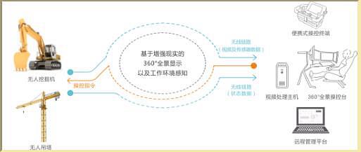 在工程機(jī)械上的多個(gè)關(guān)鍵位置安裝攝像頭及傳感器,視頻信號(hào)以及傳感器數(shù)據(jù)通過無線網(wǎng)絡(luò)傳輸?shù)竭h(yuǎn)程駕駛艙,駕駛艙內(nèi)的視頻處理主機(jī)對(duì)多路視頻進(jìn)行智能化拼接處理,生成360°全景畫面;360°全景操控臺(tái)的操控指令通過無線鏈路回傳到工程機(jī)械上的控制單元,最終實(shí)現(xiàn)對(duì)工程機(jī)械的遠(yuǎn)程操控。