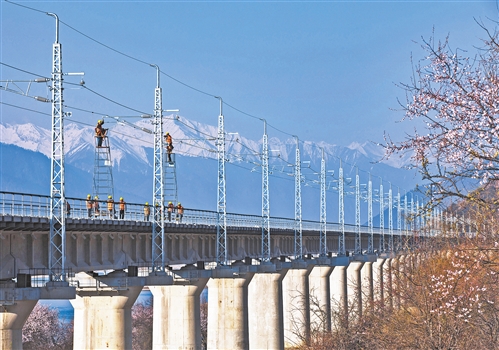 3月30日,西藏自治區(qū)林芝市,中國中鐵電氣化局集團(tuán)的技術(shù)人員正在對接觸網(wǎng)進(jìn)行精調(diào)。