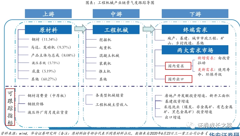 工程機(jī)械產(chǎn)業(yè)鏈中,上游為原材料及零部件、中游為各類型工程機(jī)械制造企業(yè)、下游應(yīng)用領(lǐng)域主要為基礎(chǔ)設(shè)施建設(shè)、房地產(chǎn)、礦山挖掘等。