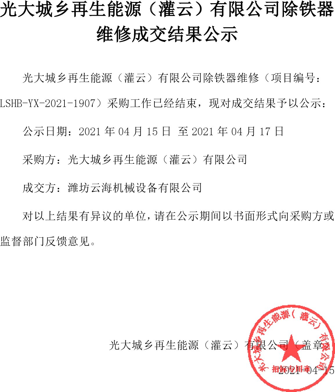 移動(dòng)版:江蘇:光大城鄉(xiāng)再生能源(灌云)有限公司除鐵器維修成交結(jié)果公示