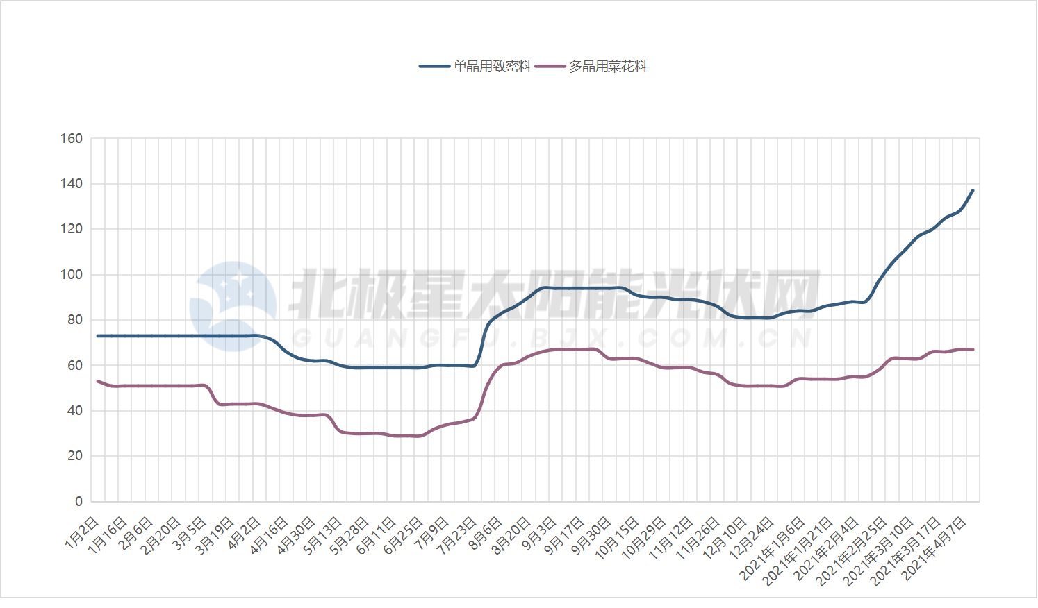 據(jù)北極星太陽能光伏網(wǎng)跟蹤PVInfolink每周報價,從去年底至今,多晶硅料價格一路走高,本周單晶用致密料均價137元/kg,較年初上漲65%,高價沖破140漲至145元/kg;多晶用菜花料最高價77元/kg,市場均價67元/kg,較年初上漲31%。