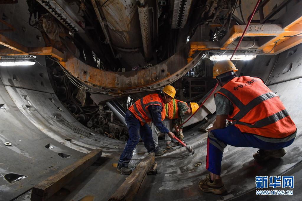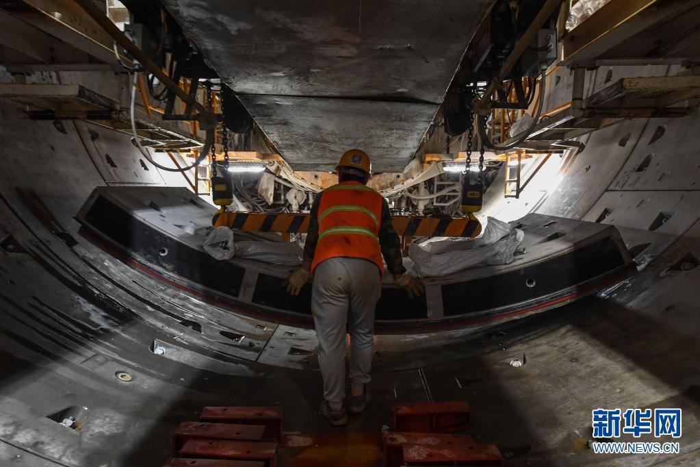 4月28日,施工人員在深圳地鐵14號線共建管廊大縱坡隧道拼裝管片。新華社記者 劉大偉 攝