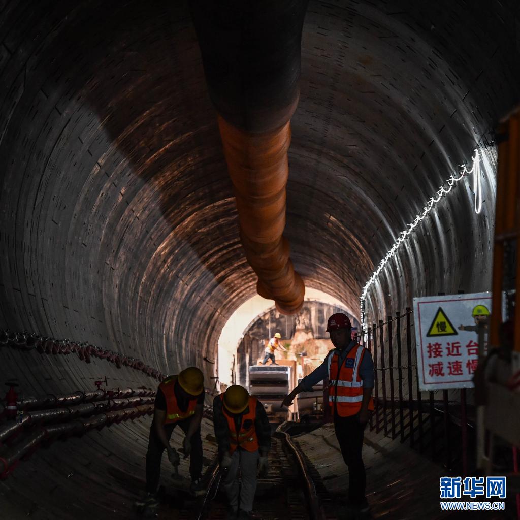 4月28日,施工人員在深圳地鐵14號線共建管廊大縱坡隧道檢修軌枕。新華社記者 劉大偉 攝