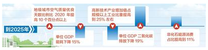 實(shí)施意見明確了主要目標(biāo):到2025年,產(chǎn)業(yè)結(jié)構(gòu)、能源結(jié)構(gòu)、運(yùn)輸結(jié)構(gòu)明顯優(yōu)化,綠色產(chǎn)業(yè)比重顯著提升,基礎(chǔ)設(shè)施綠色化水平不斷提高,生產(chǎn)生活方式綠色轉(zhuǎn)型成效顯著,能源資源配置更加合理、利用效率大幅提高;生態(tài)環(huán)境持續(xù)改善,主要污染物排放總量持續(xù)減少;市場導(dǎo)向的綠色技術(shù)創(chuàng)新體系更加完善,法規(guī)政策體系更加有效,綠色低碳循環(huán)發(fā)展的生產(chǎn)體系、流通體系、消費(fèi)體系初步形成;地級城市空氣質(zhì)量優(yōu)良天數(shù)比例比2020年提高10個(gè)百分點(diǎn)以上,單位GDP能耗下降15%,單位GDP二氧化碳排放下降19%,高新技術(shù)產(chǎn)業(yè)增加值占規(guī)模以上工業(yè)比重提高到25%左右,非化石能源消費(fèi)占比提高到11%。