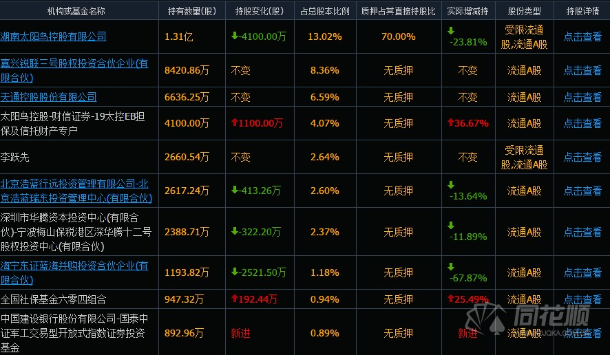 截至2021年一季度末,公司第一大股東仍為太陽鳥控股有限公司。