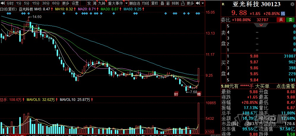 關(guān)注同花順財(cái)經(jīng)(ths518),獲取5月13日,亞光科技(300123)高開高走,并放出天量成功收獲20cm漲停,報(bào)9.88元/股,全天成交10.39億元,換手率11%。到底是什么原因使得股價(jià)低迷多日的亞光科技暴漲呢?或與昨日公告有關(guān)。