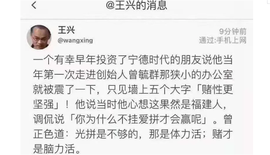美團王興曾講過一個故事,一個做早期投資的朋友走進創(chuàng)業(yè)時期寧德時代董事長曾毓群狹小的辦公室時,只見墻上掛了五個字:賭性更堅強。