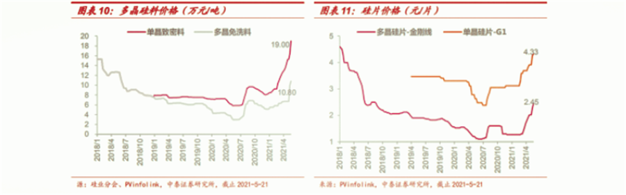 則表示,當(dāng)前硅料價格持續(xù)上漲,單晶方面,五一后成交價在缺料的影響下進一步上揚,目前一線企業(yè)已經(jīng)有價無貨;多晶方面,價格跟隨單晶料漲價。同時,硅片價格上漲,單晶方面,硅料短缺影響開工率,電池廠反應(yīng)硅片長單交付量不足,價格堅挺;多晶方面,印度需求受疫情影響稍有放緩,但硅料上漲繼續(xù)推高價格。