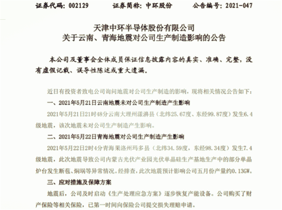 5月22日2時4分青海果洛州瑪多縣(北緯34.59度,東經(jīng)98.34度)發(fā)生7.4級地震,此次地震導(dǎo)致中環(huán)股份內(nèi)蒙古光伏產(chǎn)業(yè)園光伏單晶硅生產(chǎn)基地生產(chǎn)中的部分單晶爐臺發(fā)生斷苞、燜堝等異常情況。經(jīng)排查,此次地震預(yù)計影響公司五月份產(chǎn)量約0.13GW。