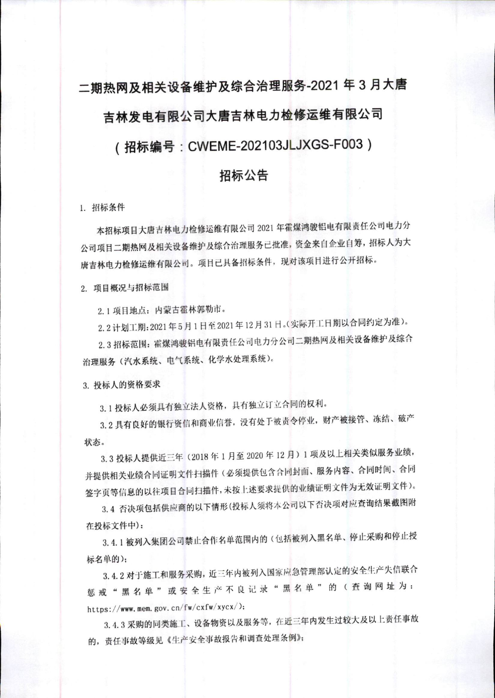 【二期熱網(wǎng)及相關(guān)設(shè)備維護(hù)及綜合治理服務(wù)-2021年3月大唐吉林發(fā)電有限公司大唐吉林電力檢修運(yùn)維有限公司】招標(biāo)公告