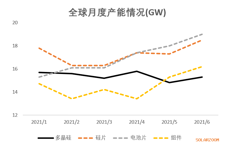 2021年4月,受產(chǎn)業(yè)鏈價(jià)格影響,導(dǎo)致整體市場(chǎng)需求略有下降,中國(guó)大陸市場(chǎng)的太陽能電池片產(chǎn)量較上月略有下降