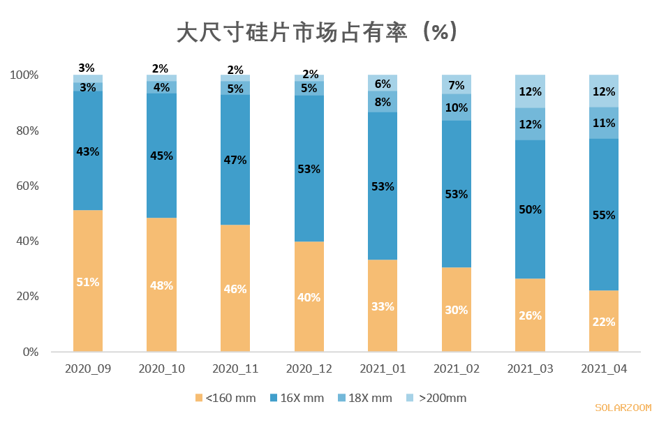 從2020年9月起,大尺寸硅片(>160mm)的市場(chǎng)從49%增加到78%
