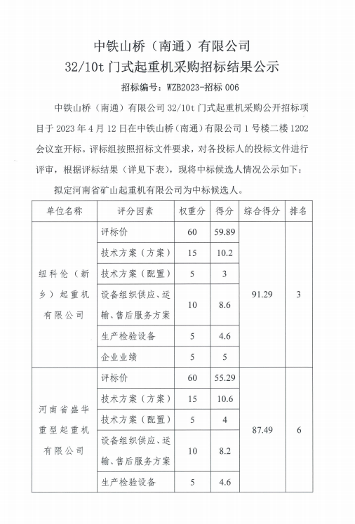 中鐵山橋(南通)有限公司32/10t門式起重機采購招標(biāo)結(jié)果公示