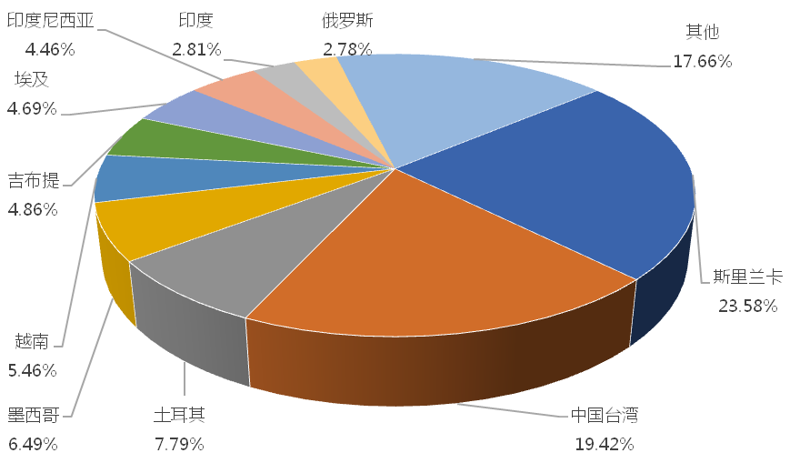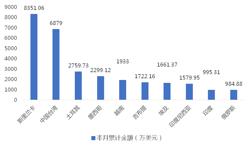 1-6月,我國(guó)龍門式起重機(jī)出口金額排名前十的國(guó)家/地區(qū)分別為斯里蘭卡、中國(guó)臺(tái)灣、土耳其、墨西哥、越南、吉布提、埃及、印度尼西亞、印度、俄羅斯,合計(jì)占我國(guó)該產(chǎn)品出口總額的82.34%。其中,向斯里蘭卡出口最多,金額為8351.06萬美元,占出口總額的23.58%。
