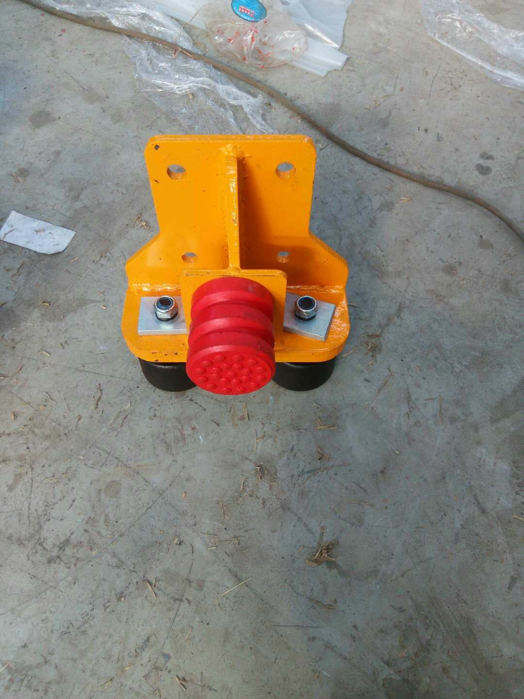 本裝置適用于單梁,雙梁起重機(jī)大車運(yùn)行機(jī)構(gòu)及雙梁小車運(yùn)行機(jī)構(gòu),適用車輪分別為LD輪結(jié)構(gòu)和角形軸承箱車輪結(jié)構(gòu)。本裝置加裝在運(yùn)行端梁前端,依靠運(yùn)行軌道兩側(cè)的水平輪,限制起重機(jī)大車輪沿啃軌傾向,在大車車輪摩擦軌道之前,先行以滾動方式與軌道接觸,來抵消大車運(yùn)行部分水平側(cè)向力,防止啃軌;同時兩只水平輪安裝位置低于軌道平面及車輪輪沿,這也相當(dāng)于**限度地加高了車輪輪沿的高度。防止因為原車輪輪沿太淺而造成的起重機(jī)脫軌事故。