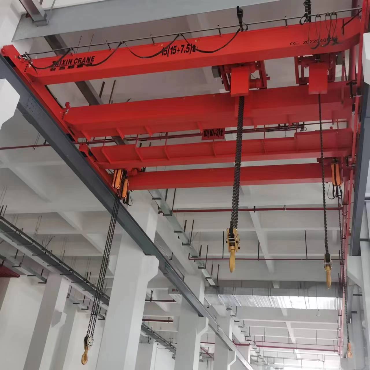 雙梁橋式起重機一般由機械、電氣和金屬結構三大部分組成。雙梁橋式起重機外形象一個兩端支承在平行的兩條架空軌道上 平移運行的單跨平板橋。