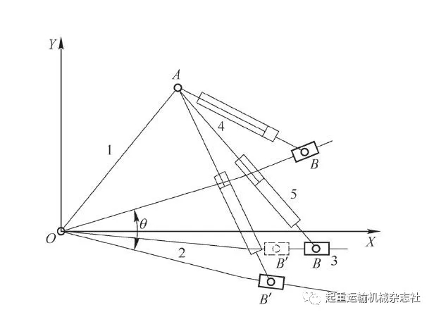 2)當滑塊和氣彈簧組合處于 OAB ˊ 位置:滑塊在最短距離, OB ˊ最短,氣彈簧 AB 伸到最長安裝距離, 桿件狀態(tài)如圖2 所示,對應的桿件2 與 X 軸夾角為- ∠ B ˊ OX ,可調(diào)節(jié)量最大。
