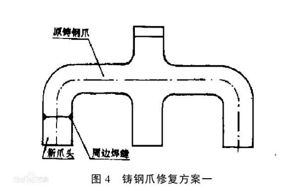 對于這三種情況的鋼爪都得將其鋸掉,并補焊上新鋼爪。補焊新鋼爪時,我們作了兩種方案。圖4所示為第一種方案。