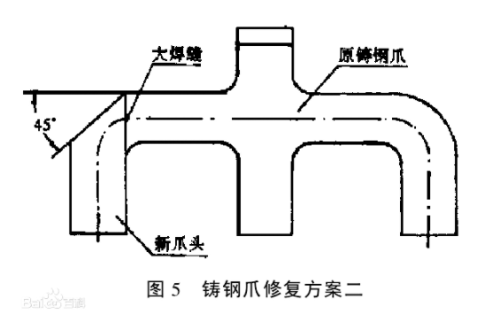 將有缺陷的鋼爪鋸掉一截,然后開坡口補焊上一截新圓鋼。圖5所示為第二種方案。