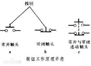 按鈕是一種人工控制的主令電器。主要用來(lái)發(fā)布操作命令,接通或開(kāi)斷控制電路,控制機(jī)械與電氣設(shè)備的運(yùn)行。按鈕的工作原理很簡(jiǎn)單(見(jiàn)圖1)對(duì)于常開(kāi)觸頭(圖a),在按鈕未被按下前,電路是斷開(kāi)的,按下按鈕后,常開(kāi)觸頭被連通,電路也被接通;對(duì)于常閉觸頭(圖b),在按鈕未被按下前,觸頭是閉合的,按下按鈕后,觸頭被斷開(kāi),電路也被分?jǐn)?。由于控制電路工作的需要,一只按鈕還可帶有多對(duì)同時(shí)動(dòng)作的觸頭(圖c)。