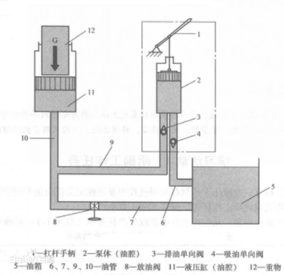 當(dāng)壓下杠桿手柄l時(shí),帶動(dòng)小活塞下移,泵體2中的小油腔工作容積減小,便把其中的油液擠出,推開(kāi)排油單向閥3(此時(shí)吸油單向閥4自動(dòng)關(guān)閉了通往油箱的油路),油液便經(jīng)油管進(jìn)入液壓缸(油腔)11,由于液壓缸(油腔)11也是一個(gè)密封的工作容積,所以進(jìn)入的油液因受擠壓而產(chǎn)生的作用力就會(huì)推動(dòng)大活塞上升,并將重物頂起做功。反復(fù)提、壓杠桿手柄,就可以使重物不斷上升,達(dá)到起重的目的。