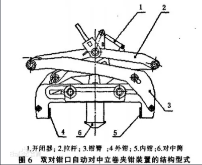 2)雙對鉗口自動對中立卷夾鉗裝置。雙對鉗口自動對中立卷夾鉗裝置的結(jié)構(gòu)型見圖6。