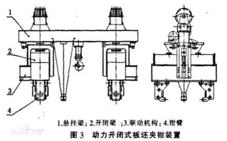 起重橫梁上裝有夾鉗開閉機(jī)構(gòu)。在準(zhǔn)備夾取板坯時。起重機(jī)使夾鉗對準(zhǔn)